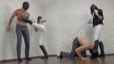 Madame Marissa just graduated from a kickboxing class, and today she wants to see if she has perfected her kicking techniques yet. She tricks her high-school bully to come over to her house, and he takes the bait. When he arrives at her place, a balaclava is forced down his face, and she strips off his shirt. She then lands a kick brutally on his bare stomach, he immediately falls down on his knees and kisses her boots, and they continue like this for a couple more rounds.